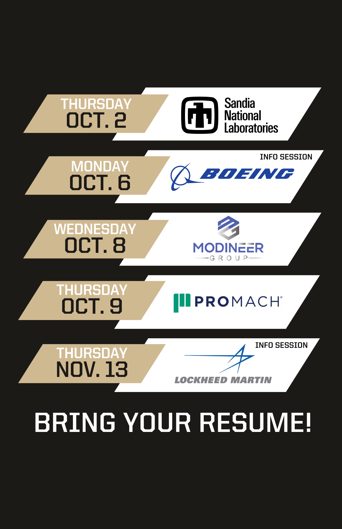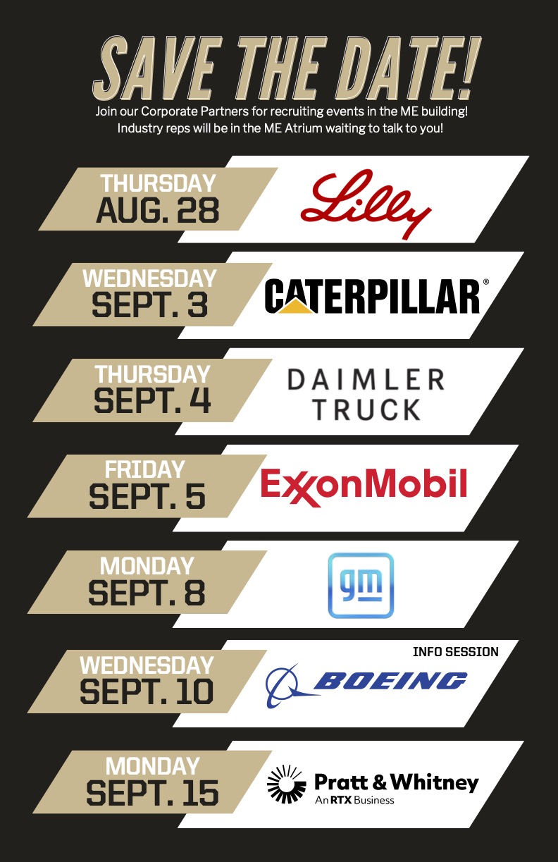 Join our Corporate Partners for these ME recruiting events! Industry representatives will be in the ME Atrium waiting to talk to you!