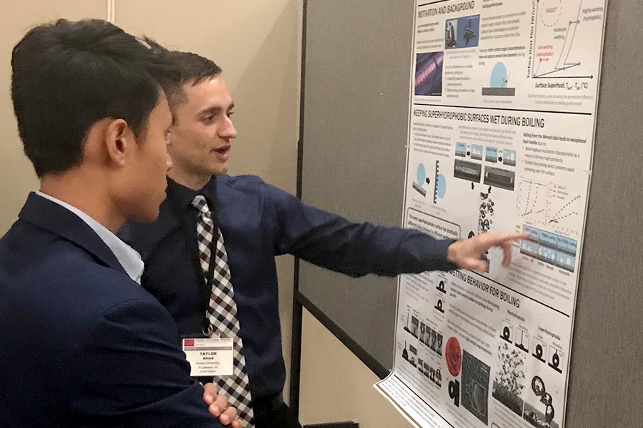 Taylor's work involves observing the effect of superhydrophobic, superhydrophilic, and non-uniformly wetting surfaces on pool boiling performance.  His poster was entitled, "The Critical Role of Dynamic Surface Wettability on Bubble Dynamics and Boiling Performance," Taylor P. Allred, Justin A. Weibel, Suresh V. Garimella.