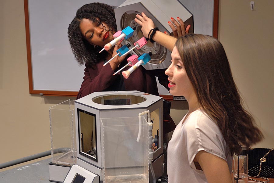 1st Place: Envie, Mina Mohsenian, Robbie Williams, Kevin Sanabria, Dina Abdulaal, Heya Kaakeh, Emily Eifert. Sanitizing a full set of makeup brushes manually can take up to 12 hours, depending on brush density. Moreover, dirty makeup brushes become breeding grounds for bacteria, posing dermatological risks to makeup clients. Team Rêve has developed Envie: the first makeup brush sanitation device marketed to makeup professionals that washes, dries and sanitizes brushes within 15 minutes. Team Rêve started with consumer research, conducting approximately 100 interviews that reached local beauty schools, salons, beauticians, and consumers to not only solidify customer requirements, but also deliver a human-centered design. The design of Envie's five subsystems of brush holding, power, dynamics, wash cycle, and dry cycle were driven by experimentation and fundamental mechanical engineering concepts. With 100% of professionals willing to pay between $300.00 and $400.00 for a cleaning machine, the team is confident that Envie will enter the $1.6 billion beauty device market with strong market value.