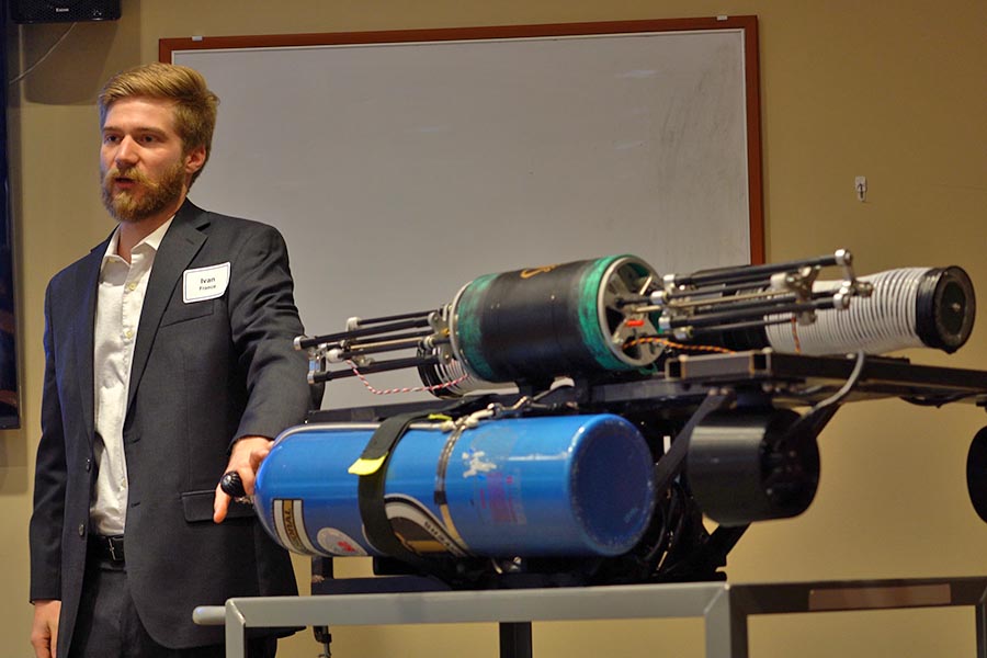 3rd Place: Underwater Robotic Oxygen Portability Assistant (UROPA), Ellis Tirman, Andrew Violette, Ivan France, David Dobben, Szymon Cias, Hyukjun Jang. Roughly 30% of the global freshwater supply is stored as groundwater and is susceptible to pollution from the extraction activities of oil & gas companies. Subterranean divers map the structure of these caverns to minimize the risk of exposure. The undertakers of this mission breathe only the oxygen they bring with them and are frequently hours from the nearest exit. The physical equipment burden drains their stamina and limits the extent to which they can perform their research. Our solution is U.R.O.P.A., an autonomous underwater vehicle (AUV) that acts as a self-guided assistant, transporting life-critical equipment on the diver’s behalf. This feat is achieved with autonomous-following capabilities paired with dynamic buoyancy control, enabling the diver to hot-swap gas tanks in the field. Through lessening the equipment burden, divers enjoy extended range without decrease in agility or safety. As a result, operating costs are reduced, leading to improved integrity of the freshwater supply.
