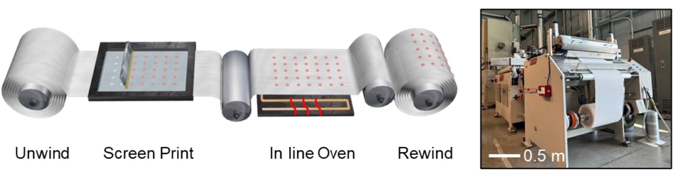 To make the bandages affordable and widely available, the team used roll-to-roll manufacturing, a technique similar to newspaper or sticker printing. The process begins when nonwoven fabric is wound into a roll and placed on the machine. As the roll unwinds, a screen printer applies the colorimetric sensors, and an in-line oven dries and cures the ink. The material is rewound, then cut to the needed size. Each bandage is multilayered, with sensors printed individually and a protective layer added to minimize blood absorption and ensure clear visibility of color changes.