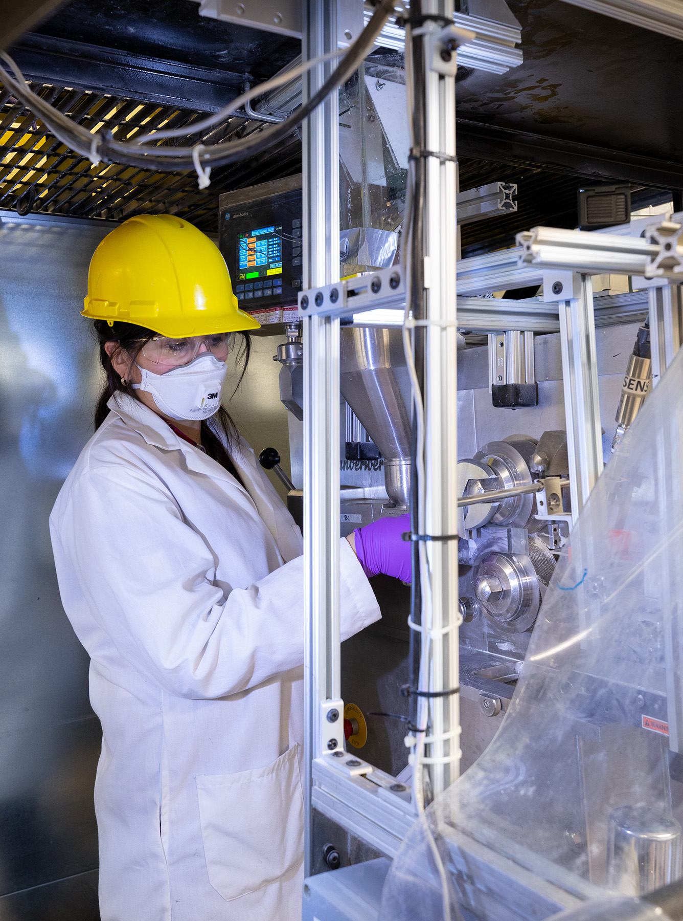 “This is the complete downstream manufacturing of pharmaceutical tablets,” said Gonzalez. “We start with powders that we mix together at a specific ratio, which get compacted into a continuous ribbon and milled into granules. The granules are then lubricated and fed to a tablet press, which creates thousands of tablets an hour. At every step, we have a variety of sensors that measure the quality and consistency of the product and the process.”