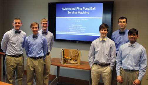 Each senior design project is reviewed by the ME 463 faculty members, with the top five projects submitted to a panel of guest judges, generally comprised of Mechanical Engineering Alumni. The Spring 2013 Malott Innovation Awards were judged by Dr. Thomas Malott, BSME ‘62, HDR ‘02; Henry Bronson, BSME ’57; Beth Holloway, BSME ’92, MSME ‘97; Steve Lorenc, BSME ’83, MSME ’86; Dr. Robert Lynall, a professor in the Krannert School of Management; and Robert Widmer, BSME ’57.