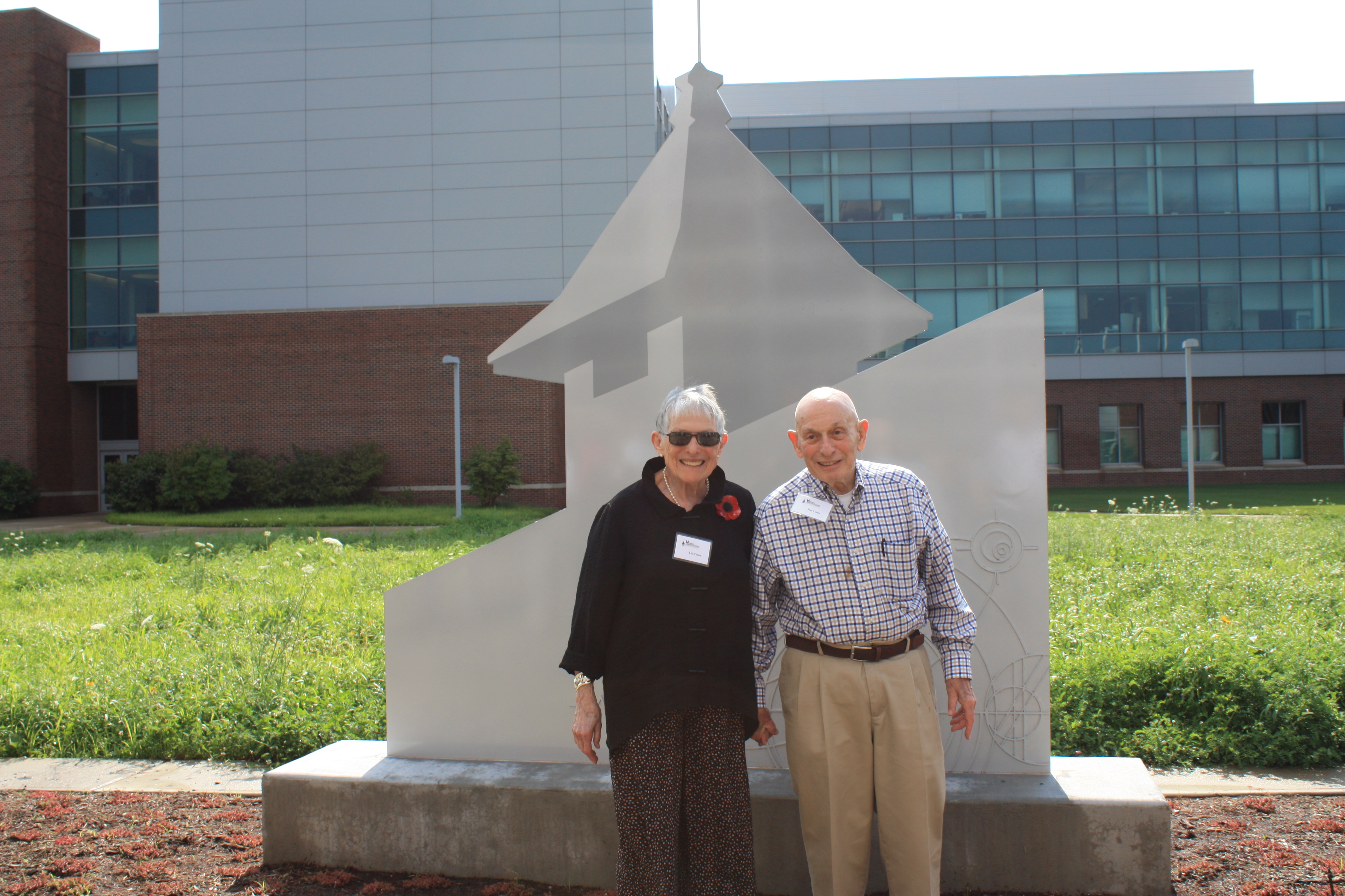 Ray W. Herrick Laboratories faculty and staff joined in celebration on Friday (July 17) for the unveiling of a new sculpture located on the west side of the new Herrick building. The new artwork was made possible through gifts from Ray and Lila Cohen, along with his friends and former students. Ray Cohen served as the Herrick Laboratories Director from 1972 – 1993. It was his wish to honor the Labs’ heritage and origins with a piece of artwork that could be enjoyed by all but also with particular significance for the students, sponsors and faculty who have collaborated on research at the laboratories.