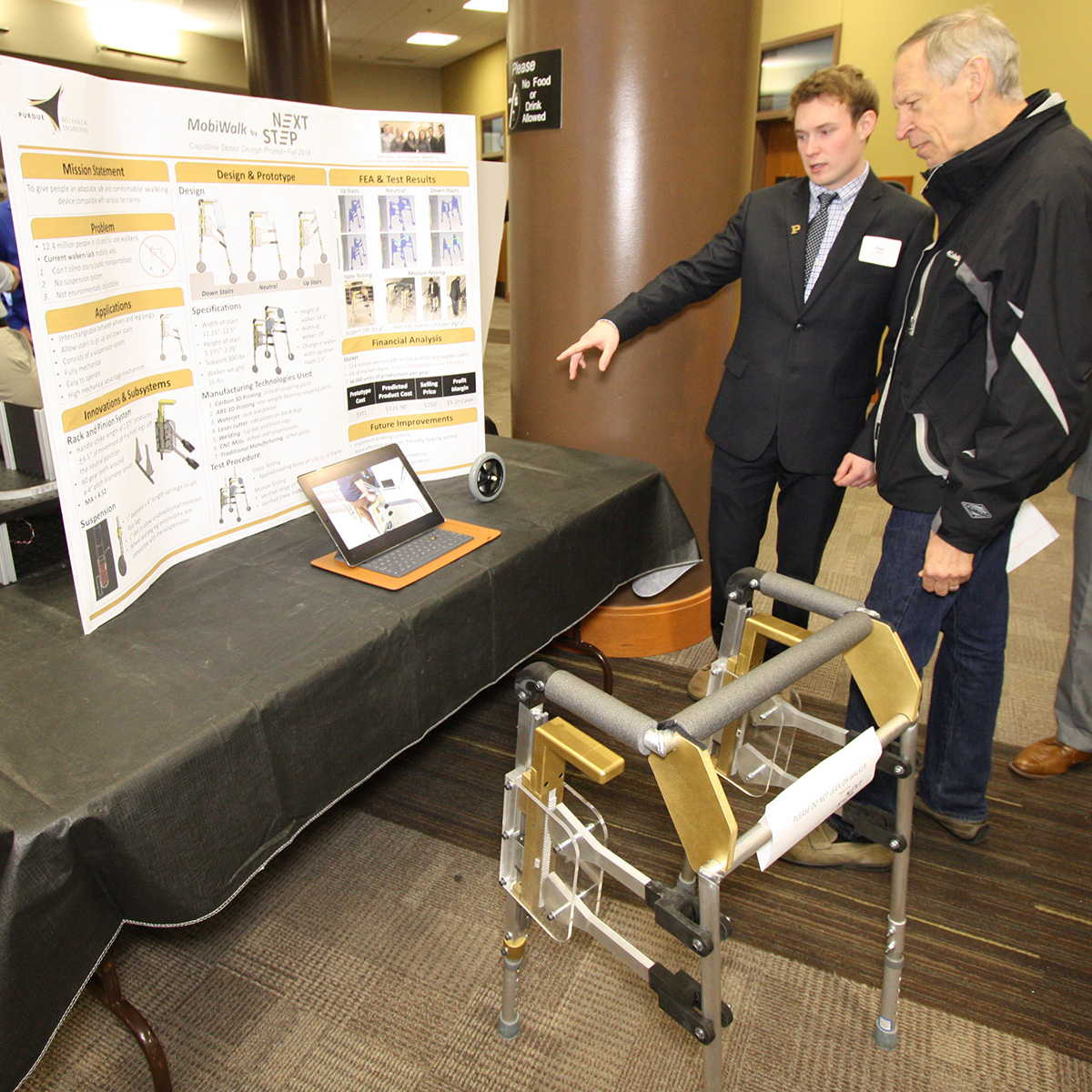 ME263 is Purdue Mechanical Engineering's sophomore design class.  It teaches the foundations of engineering design, innovation, and entrepreneurship, teaming up students to tackle a common problem with an innovative design solution.  In addition to benchmarking and market research, they also learn morphology, assembly analysis, and even get their hands dirty in making rudimentary prototypes through 3D printing, machine shop tools, or even cardboard and popsicle sticks.  At the poster show, they learn the additional skills of communication, explaining their projects to varied audiences. Watch this video about Sophomore Design.