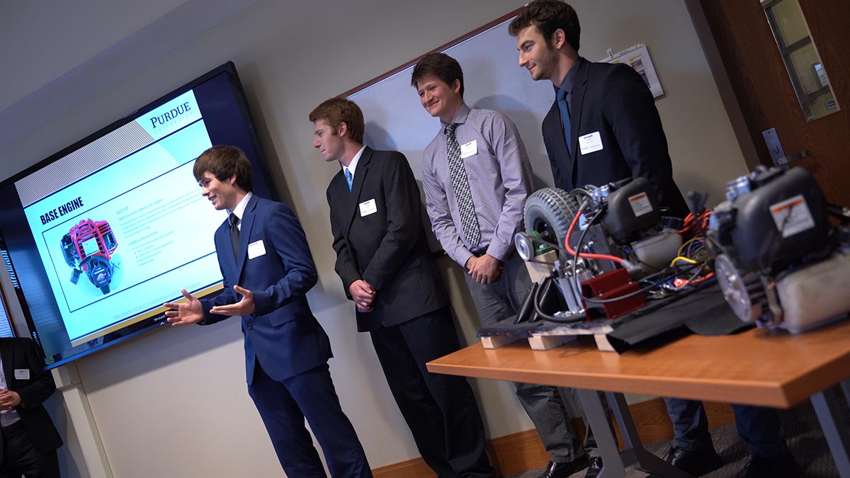 The Malott Innovation Awards are the culmination of ME463, Purdue's capstone class for seniors in Mechanical Engineering. Teams of students work closely with faculty members and industry partners to create prototype products, continually refining and improving them using the knowledge from their engineering courses over the last four years. At the end of the semester, the students present their final prototypes to a panel of Purdue ME alumni who work in various industries; this panel selects the award winning teams.
