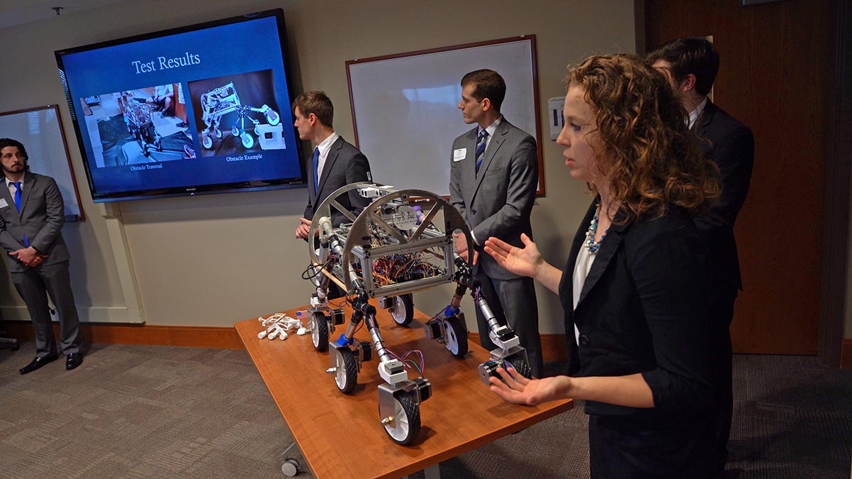 2nd place: QUESTINOS, Brandon Franz, Alex Gebhardt, Paul Mullin, Michaela Lewis, Matt Eagon, Nate Walk. Lava tubes are postulated to exist beneath the surface of the Moon. These tubes may be able to shield human inhabitants from the lethal radiation and temperature fluctuations found at the surface. However, very little is known about these formations; formal testing is required to assess the environment within the tubes (e.g. size, terrain, radiation levels, structural stability). Team Q.U.E.S.T.I.N.O.S. proposed to design an autonomous lunar vehicle capable of navigating and mapping the lava tubes in order to gather data on the unknown area. Requirements for this rover include navigating rugged terrain using simultaneous localization and mapping to create a visual map of the space. This is accomplished using an adjustable rocker-bogie system for suspension, Ackermann steering geometry, a roll cage, lidar autonomous navigation capabilities, and a control system capable of determining navigable terrain.