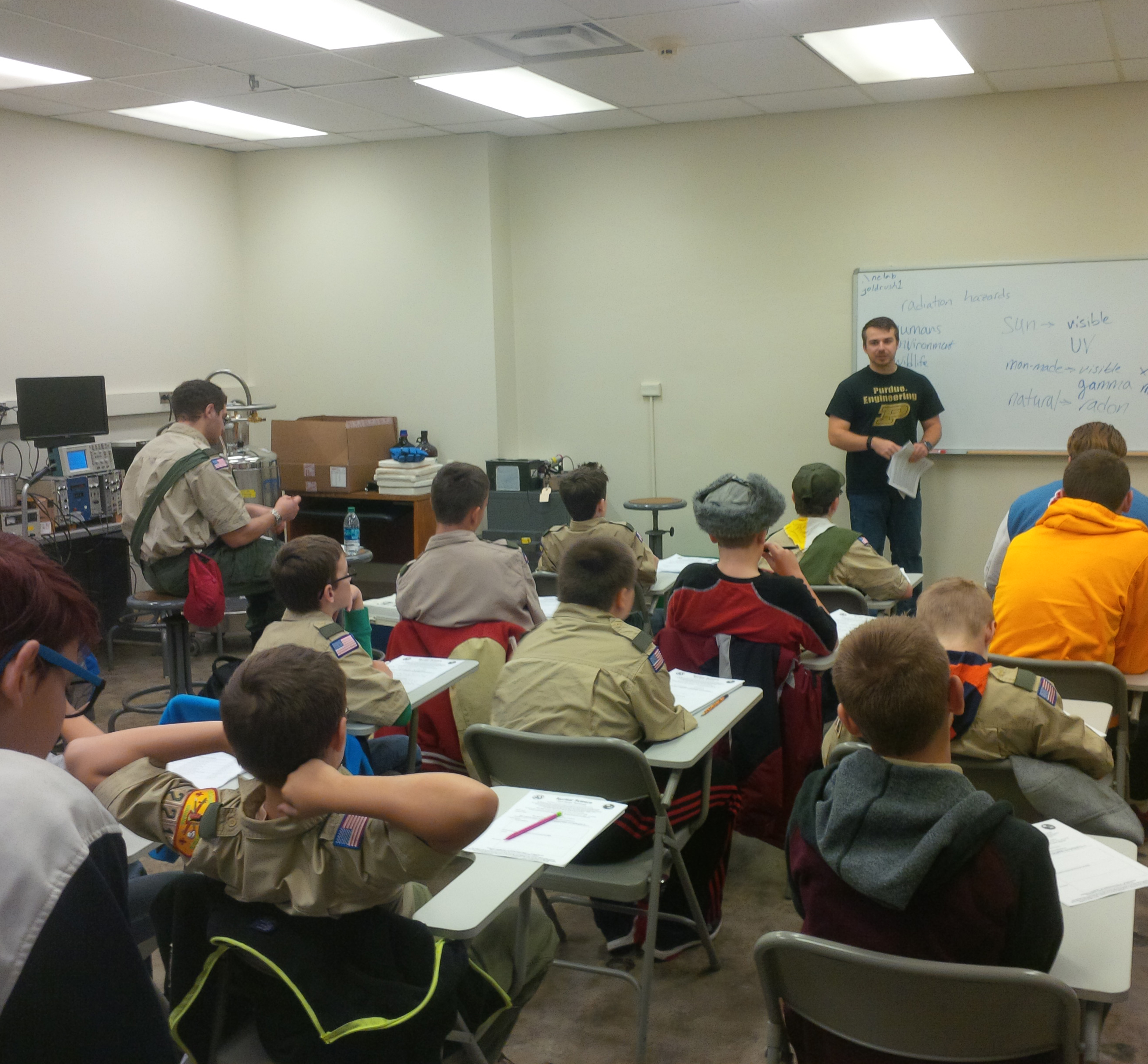 Nuclear Engineering students supported both the Nuclear Science merit badge and Engineering merit badge. Thirty-two Boy Scouts earned the Nuclear Science merit badge with the assistance of undergraduate students Robby Kile, Jack Weaver, and Andrew O’Connor (pictured right); graduate student Russell Brayfield; and Professor Robert Bean. The Scouts learned about radiation, assembled cloud chambers, learned to use GM Survey Meters, and discussed radiation safety.