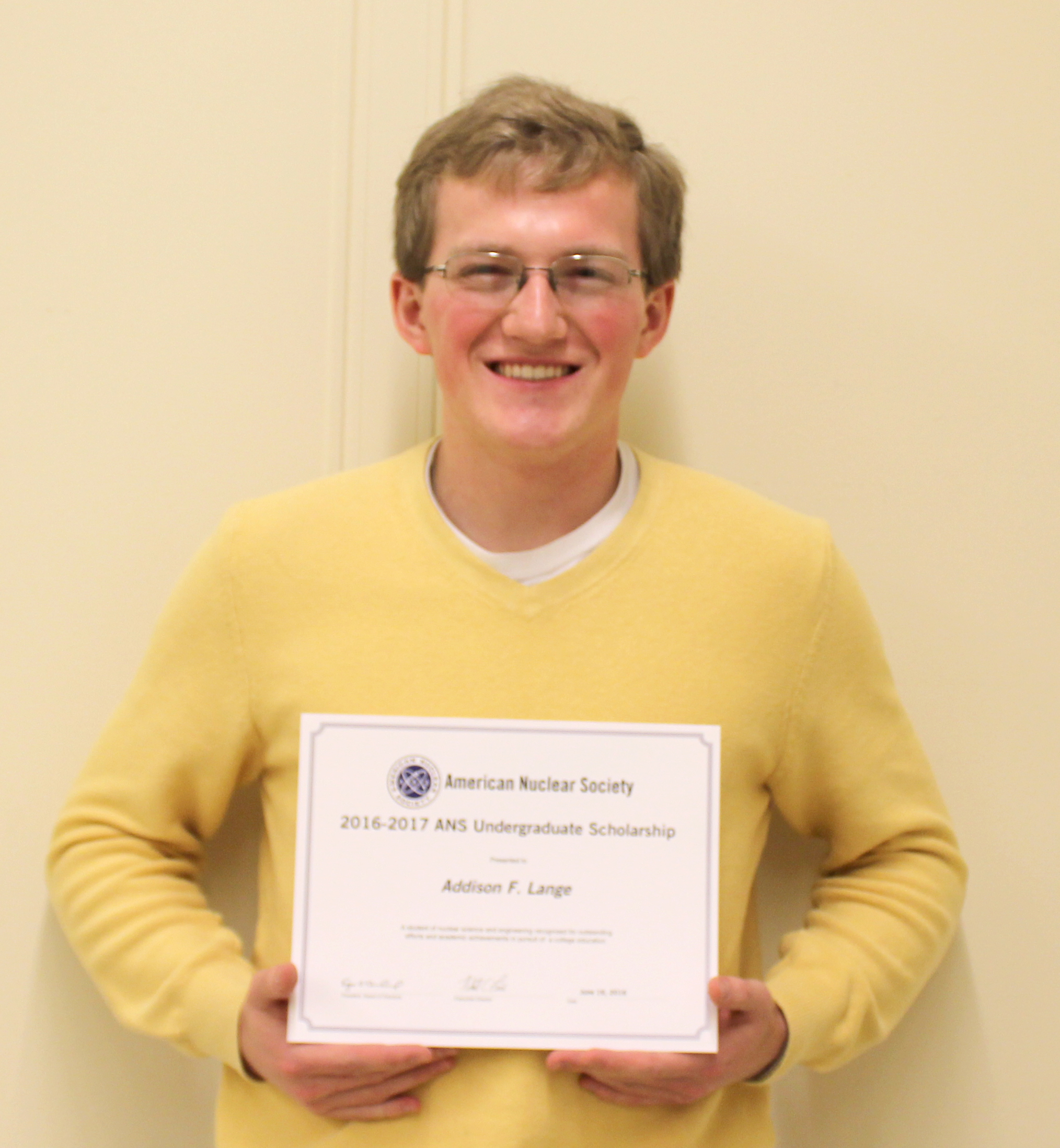 Purdue School of Nuclear Engineering student Addison Lange was recently awarded the 2016-2017 American Nuclear Society (ANS) Undergraduate Scholarship.