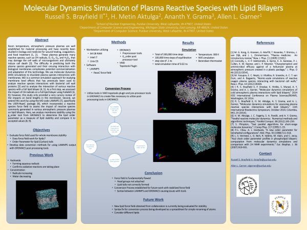 His poster entitled "Molecular Dynamics Simulation of Plasma Reactive Species With Lipid Bilayers" was coauthored with Dr. H. Metin Aktulga of Michigan State University and Drs. Ananth Grama and Allen Garner from Purdue University.