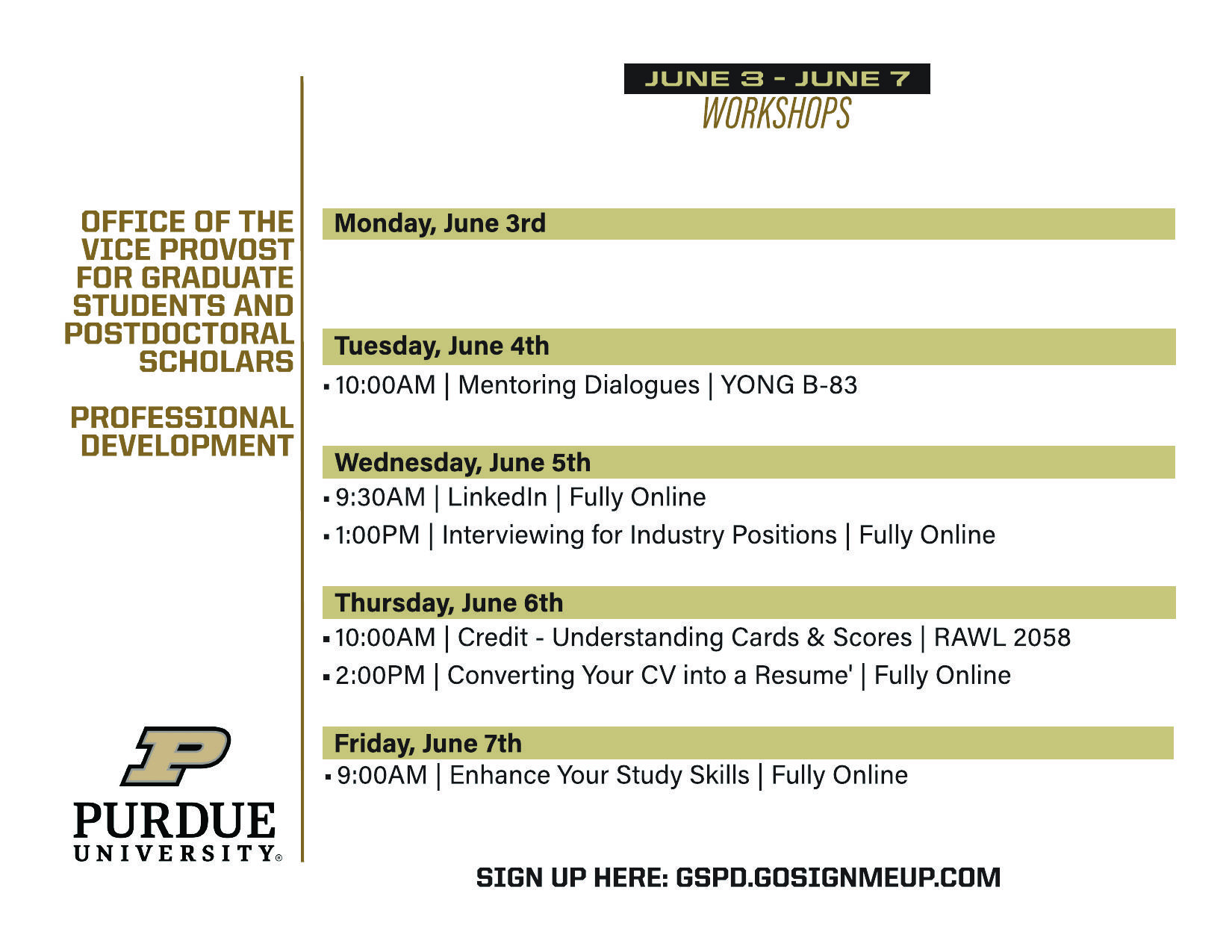 The Office of Graduate Professional Development will hold workshops the week of June 3.