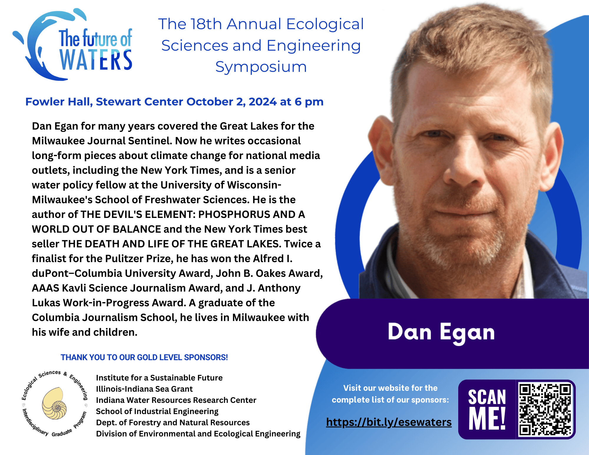 Save the date for the 2024 annual Ecological Sciences & Engineering symposium on October 2-3, 2024, The Future of WATERS: Wellbeing, Access, Technology, Ecological Impacts, Resilience, Sustainability, addressing issues such as water quality, security, policy, and access. Featuring transdisciplinary panel discussions, a keynote dialogue and book signing with New York bookseller Dan Egan, and a poster competition, this two-day event aims to foster open dialogue on the multifaceted challenges facing the water sector and generate innovative solutions and strategies for a sustainable water future. Open to the entire Purdue University, the Greater Lafayette community, and beyond, we invite students, faculty, staff, and the public to join us in exploring these critical issues.