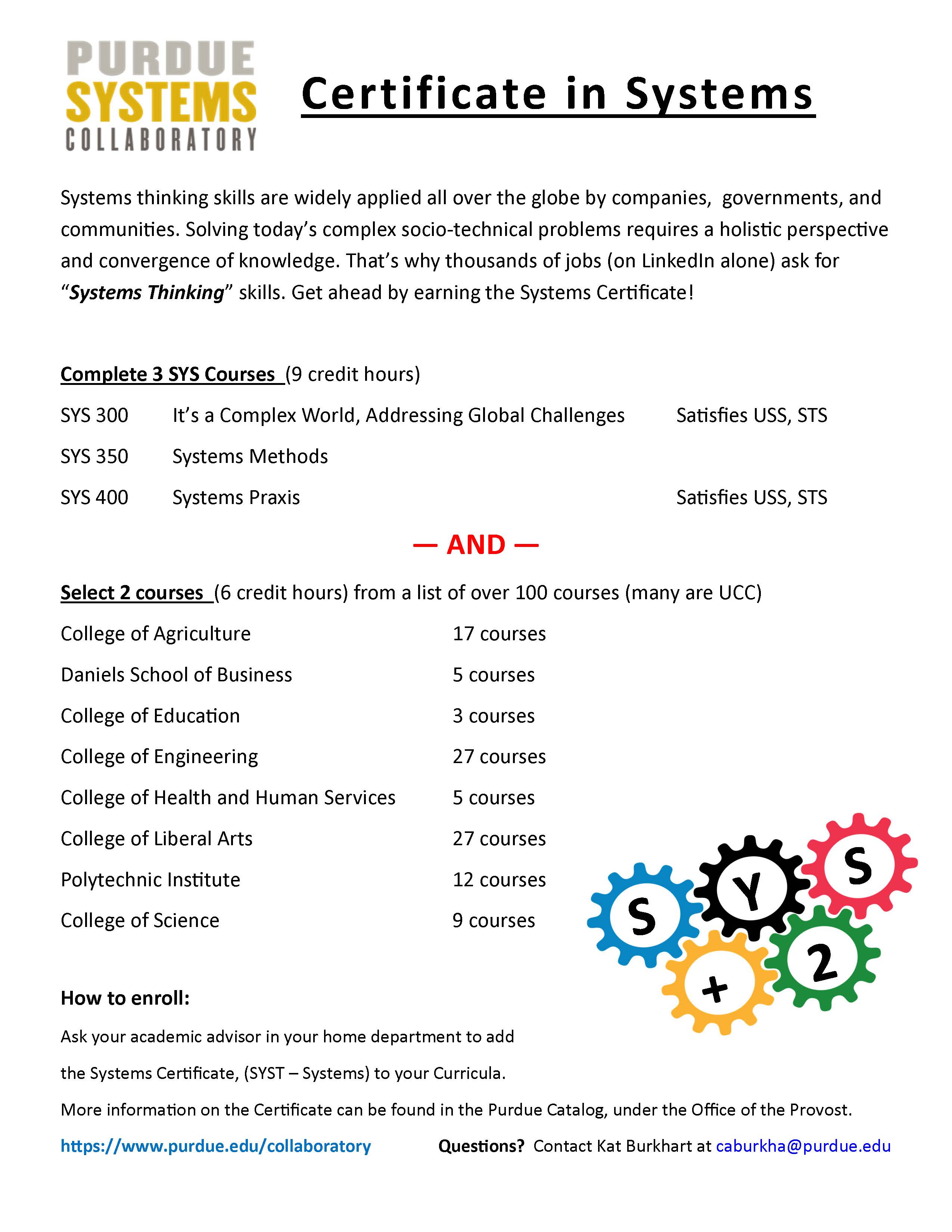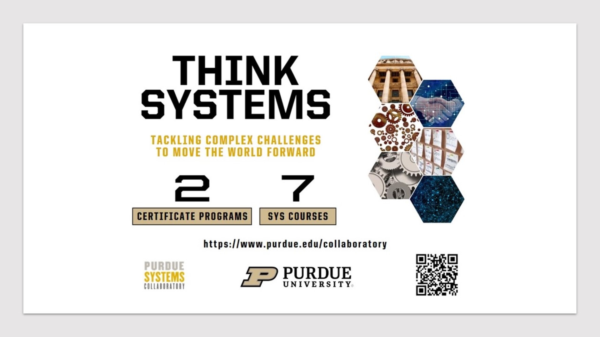 The Purdue Systems Collaboratory is offering a Systems Certificate to "equip the next generation of systems thinkers with the tools and approaches for tackling the world’s complex challenges – to move our world forward." See the flyer for more information and learn about the courses here: https://www.purdue.edu/collaboratory/