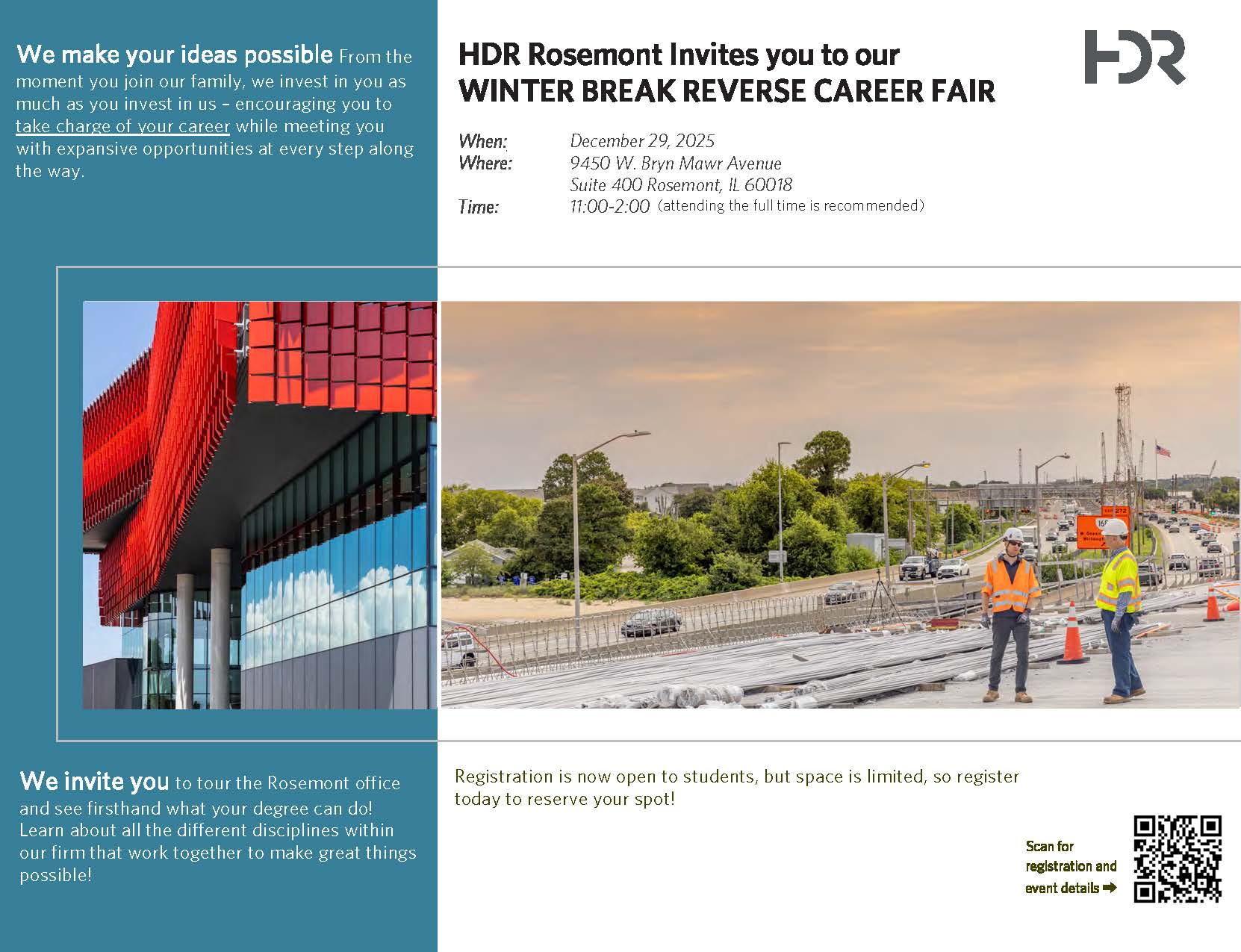 On December 29th, HDR is hosting a Reverse Career Fair in Rosemont, IL for students to hear presentations, engage in group discussions, and connect one-on-one with our engineers. Former interns will also share their experiences and answer questions about what it’s like to work at HDR. Register and find more details on the invite.