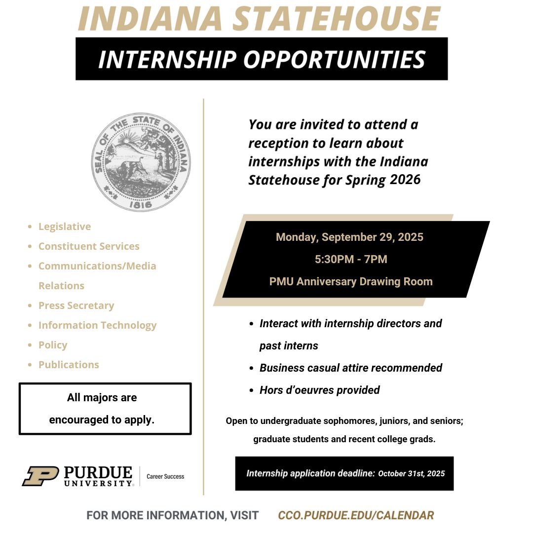 The Directors from the Indiana Statehouse Internship Program will be on campus on September 29th. They are recruiting for Spring 2026 interns through a reception in the PMU Anniversary Drawing Room. More information about this reception can be found here. See more details at https://www.cco.purdue.edu/Calendar/Event/949