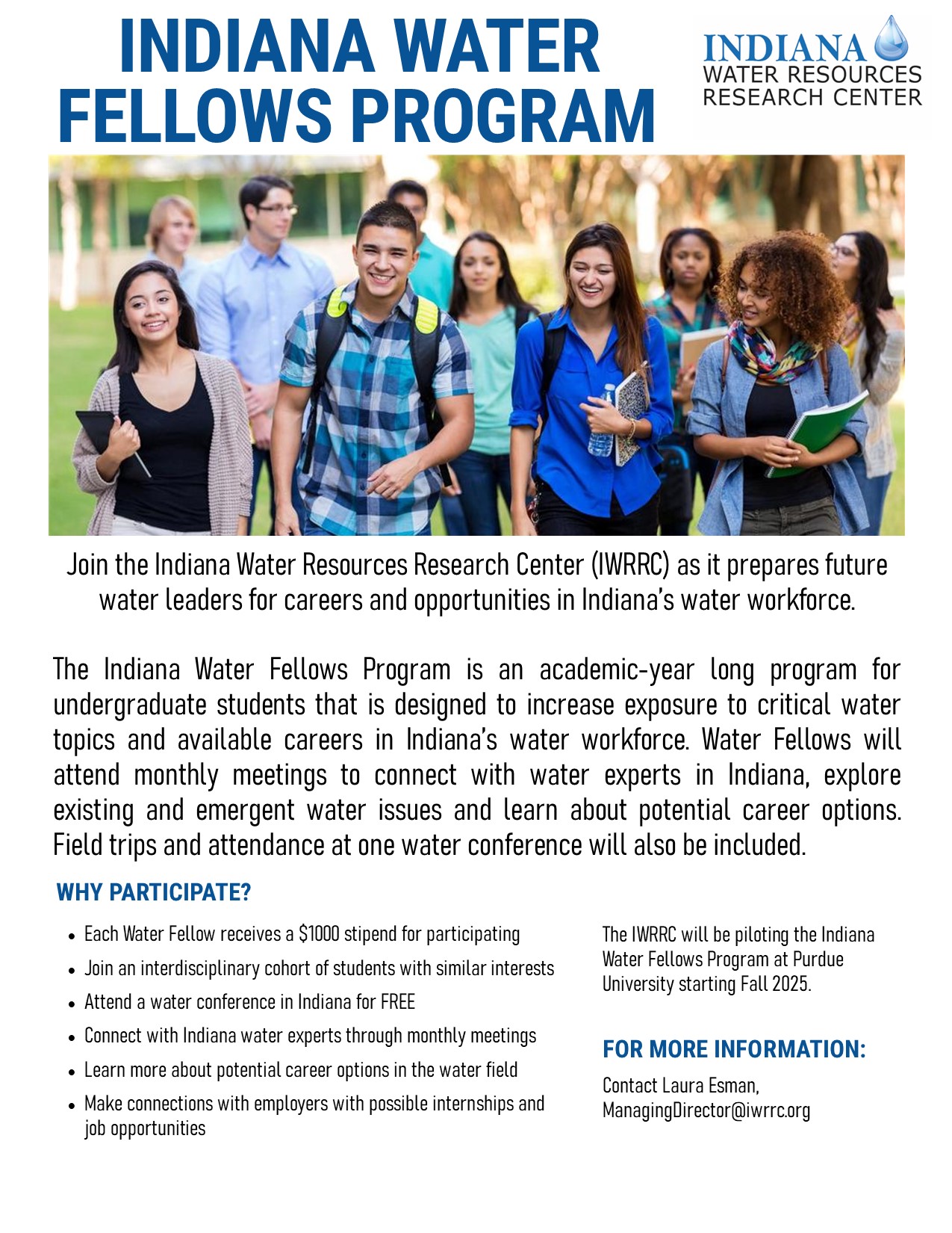 Applications are now open and available at https://iwrrc.org/indiana-water-fellows/ until October 16, 2025. See the flyer here.