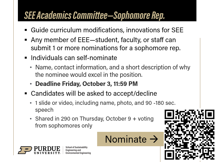 The SEE Academics Committee need to fill the sophomore representative position. SEE Faculty, staff and students can nominate 1 or more sophomores for consideration. Nominations close Friday, October 3 at 11:59pm. Use this link – https://docs.google.com/forms/d/e/1FAIpQLSeKVxx_Pv9-8y9Am0zgs5yu0bVk2_X4wWnfR3U4xoeLHcwpoA/viewform or the QR code on the flyer.